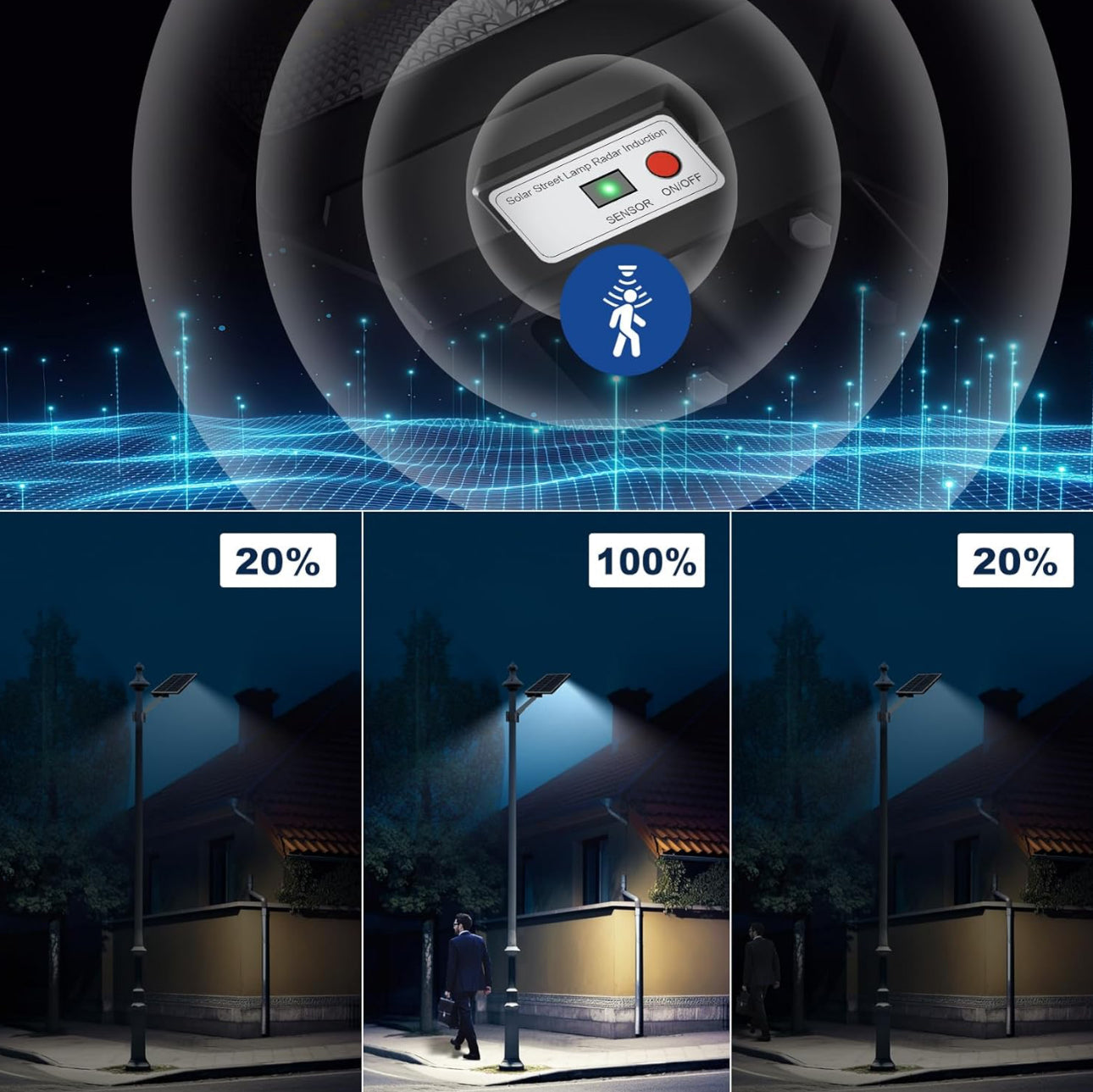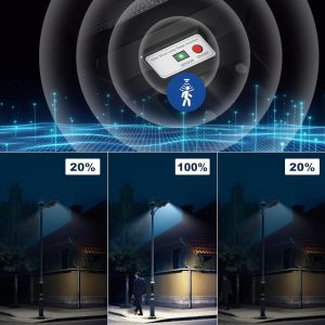 A sensitive motion sensor triggers 100% brightness when detecting movement (e.g.. pedestrians or vehicles). then dims to 30% energy-saving mode after 30 seconds of inactivity. This feature enhances security while extending battery life. making it perfect for enhancing safety in driveways. entrances. or pathways.