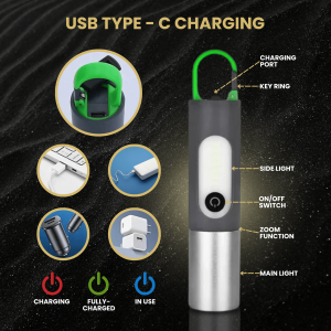 ✔ USB Rechargeable: Conveniently recharge the torch using a standard Type-C USB cable.