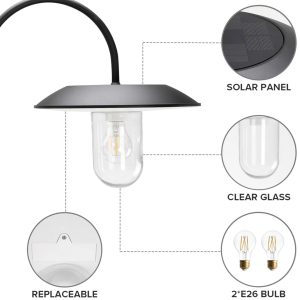 Two clear glass shades paired with ornate cast-aluminum frames evoke early 20th-century elegance. - Solar-Powered Efficiency: