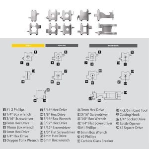 FIT MORE FUNCTIONALITY: A variety of box wrenches. hex drives. flat and Phillips screwdrivers. oxygen tank wrench. carbide glass breaker. sim card pick. cutting hook. socket drive adapter. and bottle opener.