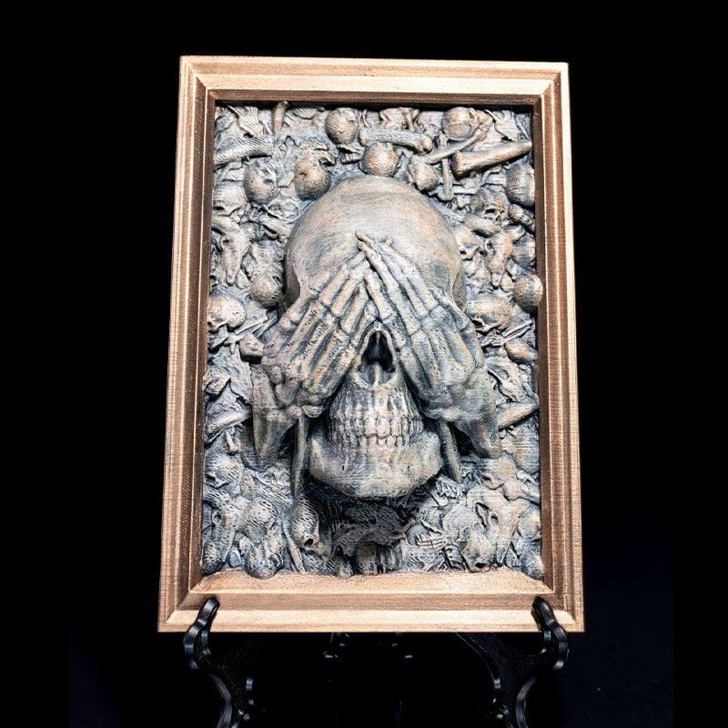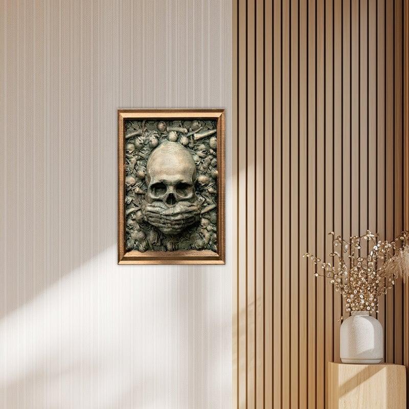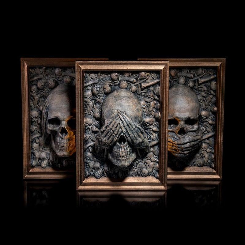 These intricately designed skull frames capture the essence of the see no evil. hear no evil. speak no evil proverb with a chillingly artistic flair.