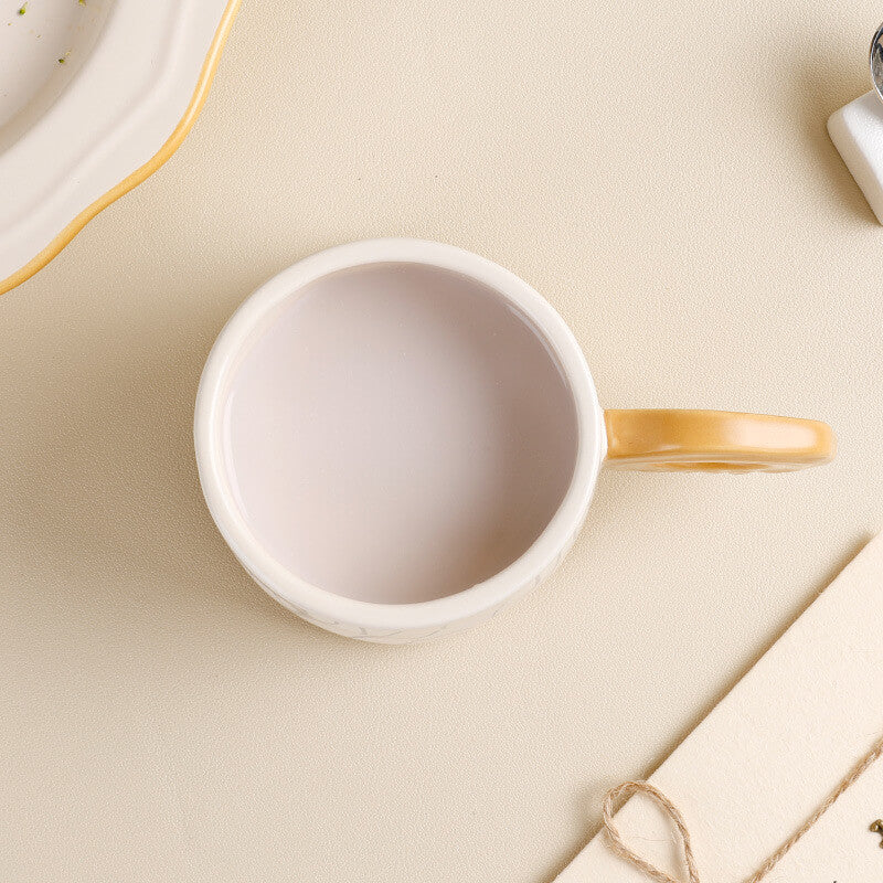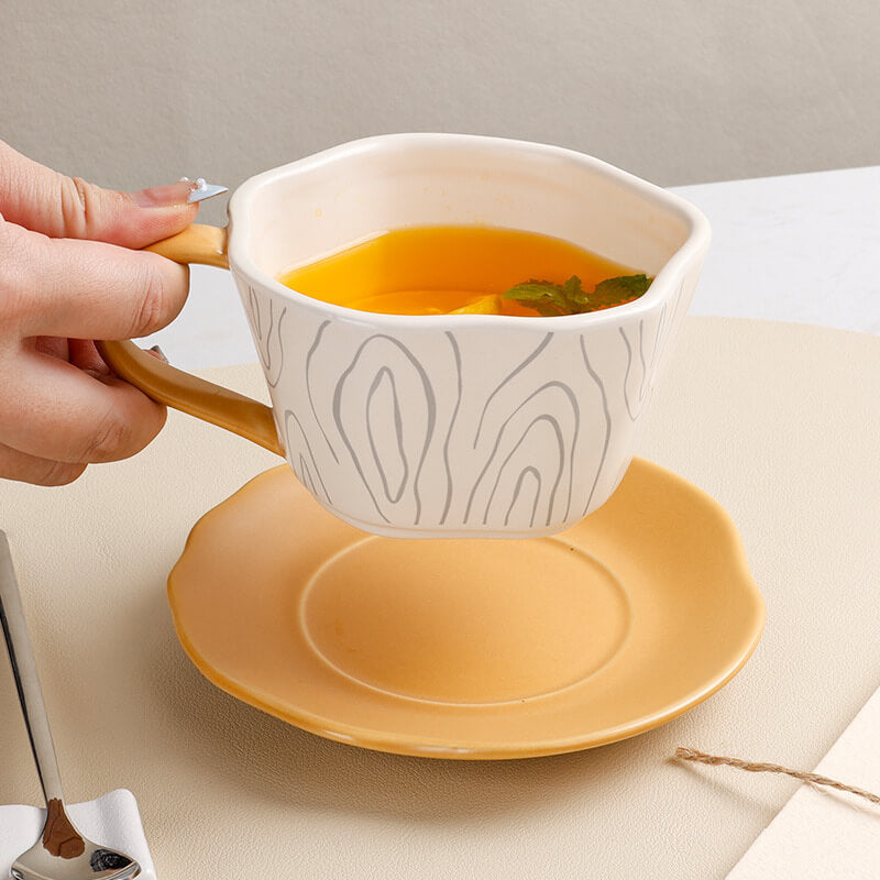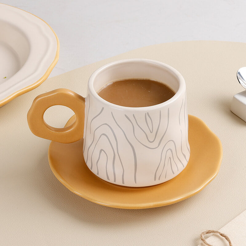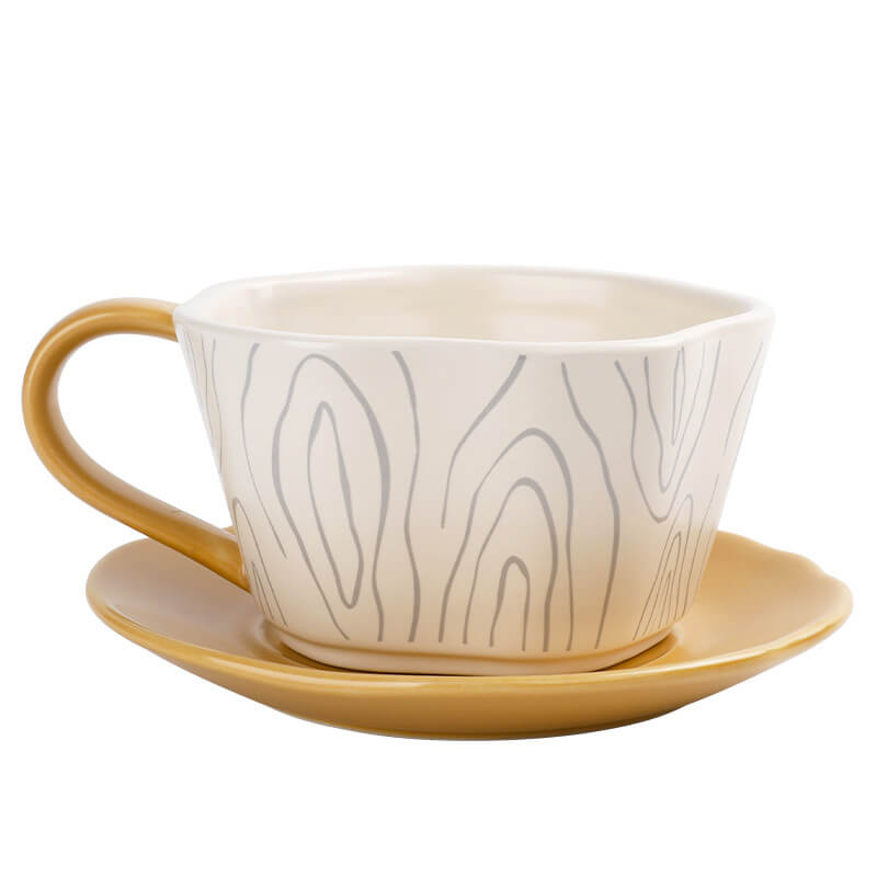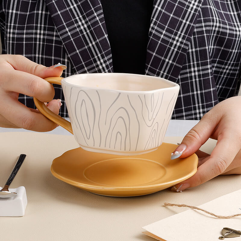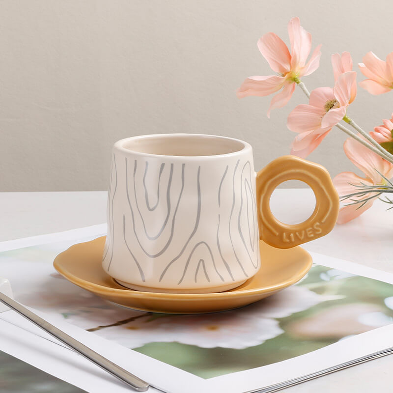 - Subtle Organic Aesthetics: The cup and saucer feature intricate tree ring patterns. symbolizing growth. time. and nature’s resilience. The design is rendered in a minimalist style. with embossed textures or underglaze prints that add depth without overwhelming the sleek silhouette.