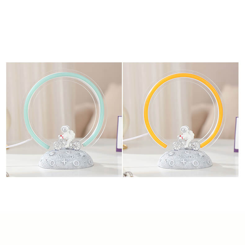- Minimalist Resin Craftsmanship: The lamp showcases a sleek astronaut figure in a classic space suit. seated on a retro-style bicycle. Crafted from smooth resin. the design features clean lines and a matte finish. available in neutral tones like white. gray. or metallic silver for a modern. futuristic look.