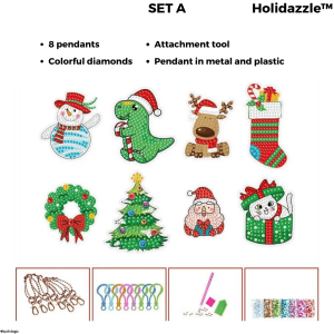 1x Lighteme Christmas DIY Diamond Painting Set with 8 or 15 pendants. diamonds in different colors. tool for attaching the diamonds and pendants in metal and plastic.