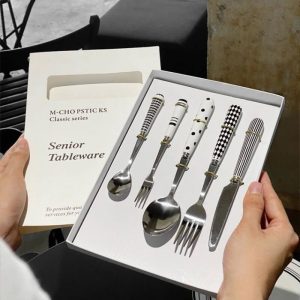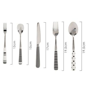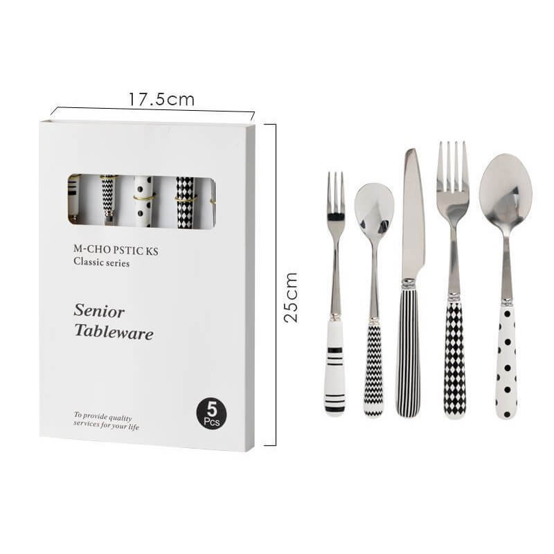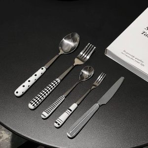 - Elegant Design: The ceramic handles feature high-temperature decal designs. often showcasing classic patterns like stripes. florals. or minimalist motifs in black and white. This technique ensures the prints are vibrant. scratch-resistant. and long-lasting. maintaining the set’s beauty through frequent use.