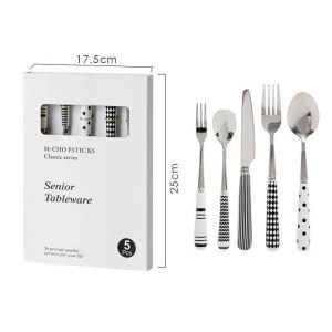 | Set Includes | 5 pieces (typically: 1 dessert/steak knife. 1 fork. 1 spoon. 1 coffee stirring spoon. 1 cake server) |