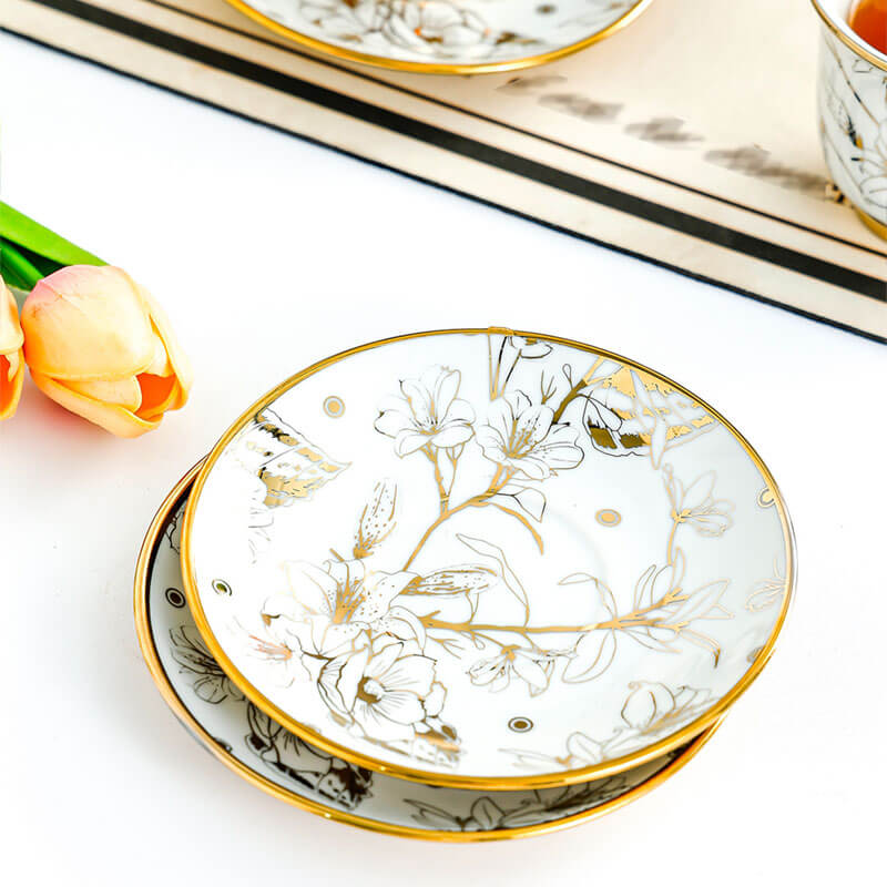 Gilded Golden Accents: Delicate gold-edged rims and hand-painted floral patterns exude timeless elegance. elevating your tableware to a work of art.