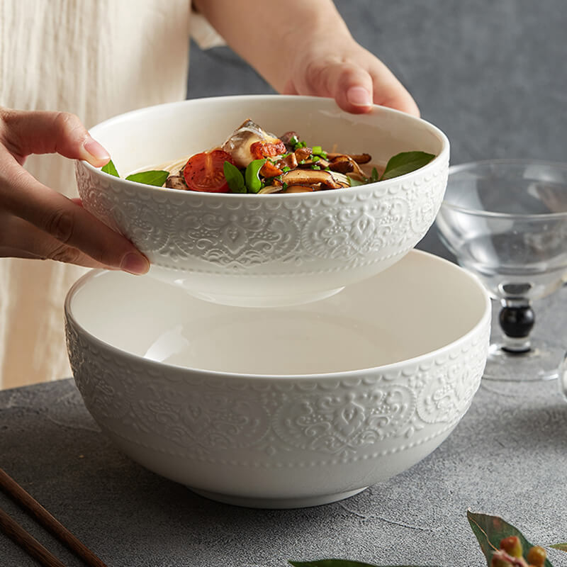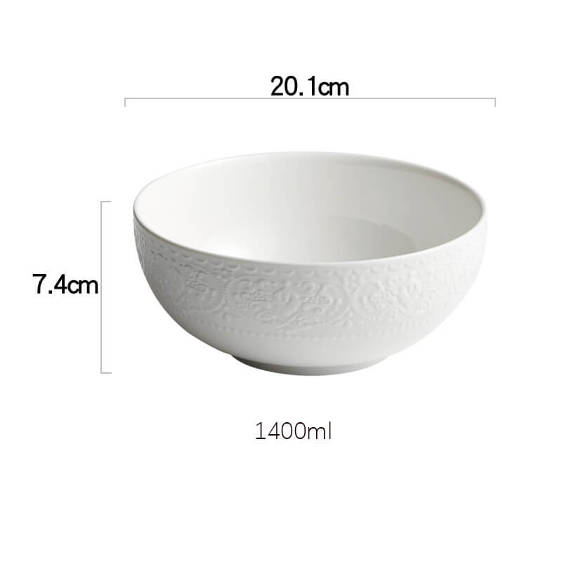 - Pure White Elegance: The glossy white glaze enhances the embossed patterns. creating a clean. timeless look that complements any decor style—from modern to traditional. The bright white color also makes it a versatile canvas for showcasing the vibrant colors of food.