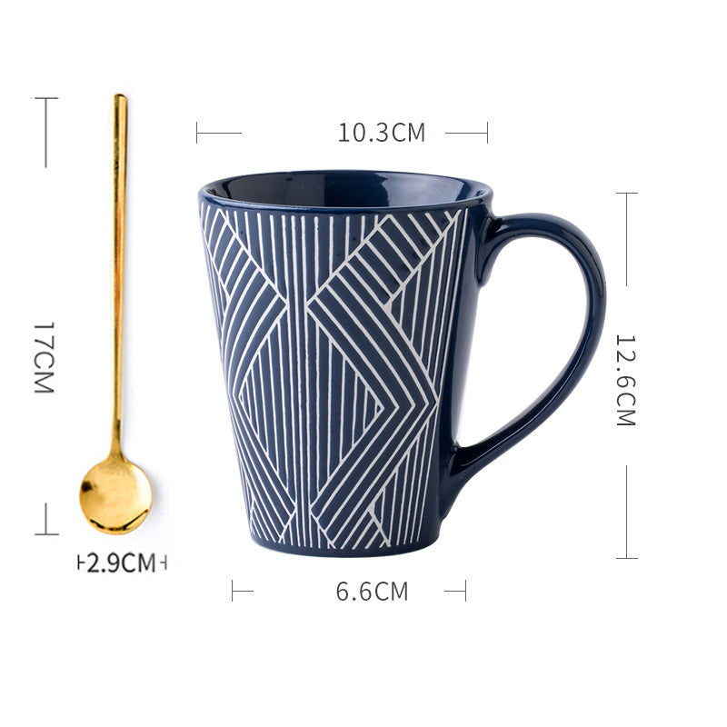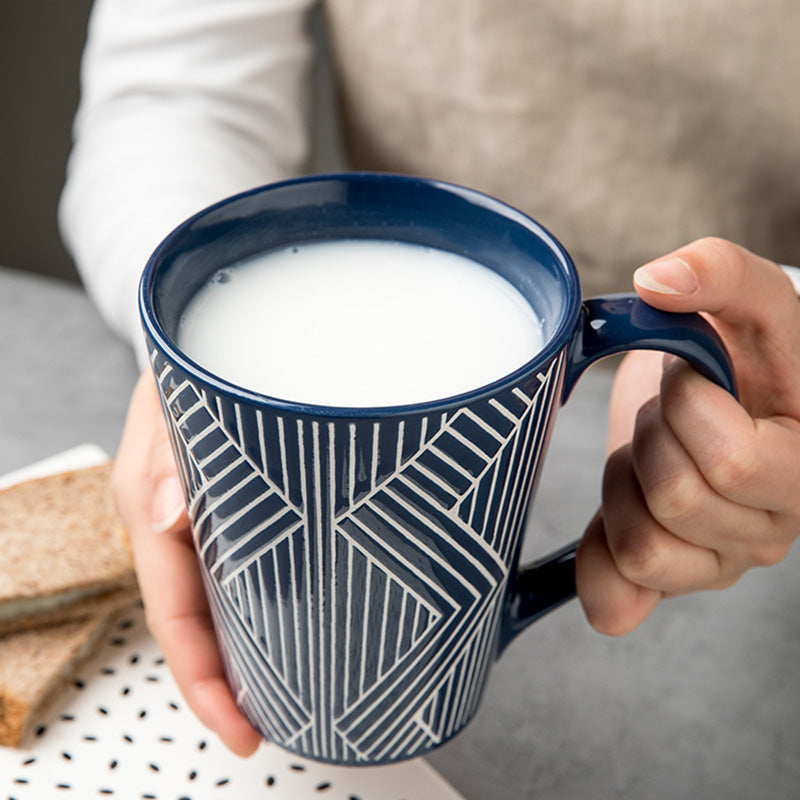 - Artistic Texture: The mug’s surface features intricately embossed geometric patterns. such as interlocking triangles. hexagonal grids. or angular lines. creating a tactile and visual feast. The raised design adds depth and a modern edge. inspired by minimalist and industrial aesthetics.