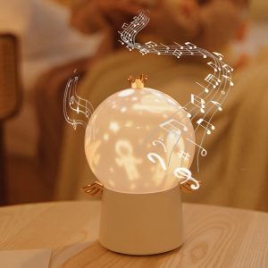 Yellow. blue. and green three-color lights can switch at will. The built-in comes with eight sleep music electronic piano songs: Sky City. Happy Birthday. Dedicated to Alice. Merry Christmas. Three Little Bears. Two Tigers. Canon. Qianxun. 360°rotating.