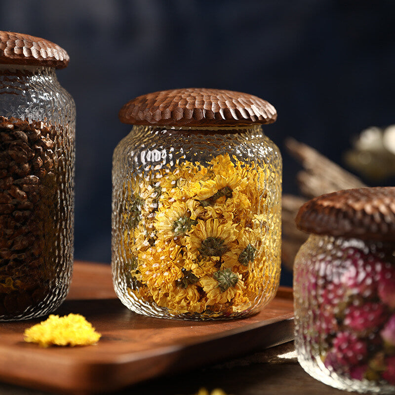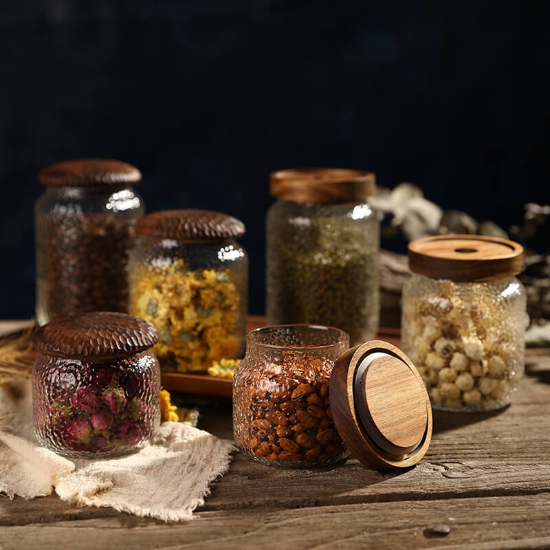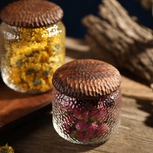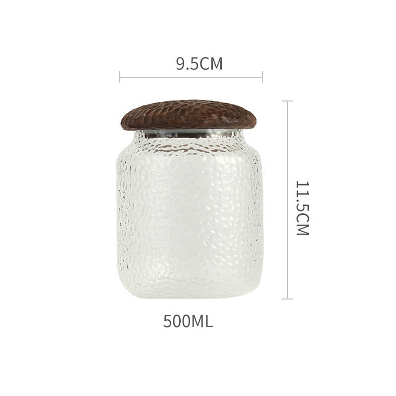 - Aesthetic Appeal: This storage jar serves as a decorative piece in the kitchen. The glass with the hammered texture and the black walnut wood lid create a visually appealing display. The hammered texture adds a unique and rustic charm. while the black walnut wood provides a touch of sophistication. It can complement various kitchen decor styles. from modern to farmhouse.