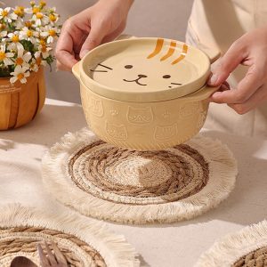 - Aesthetic Appeal: The unique woven design of this placemat is its most eye-catching feature. The combination of gourd grass. linen rope. and cotton thread creates a textured and visually interesting pattern. The natural materials give the placemat an earthy and rustic charm. making it a standout piece on any dining table. Whether used for a casual meal or a special occasion. the woven design adds a touch of elegance and warmth to the dining area.