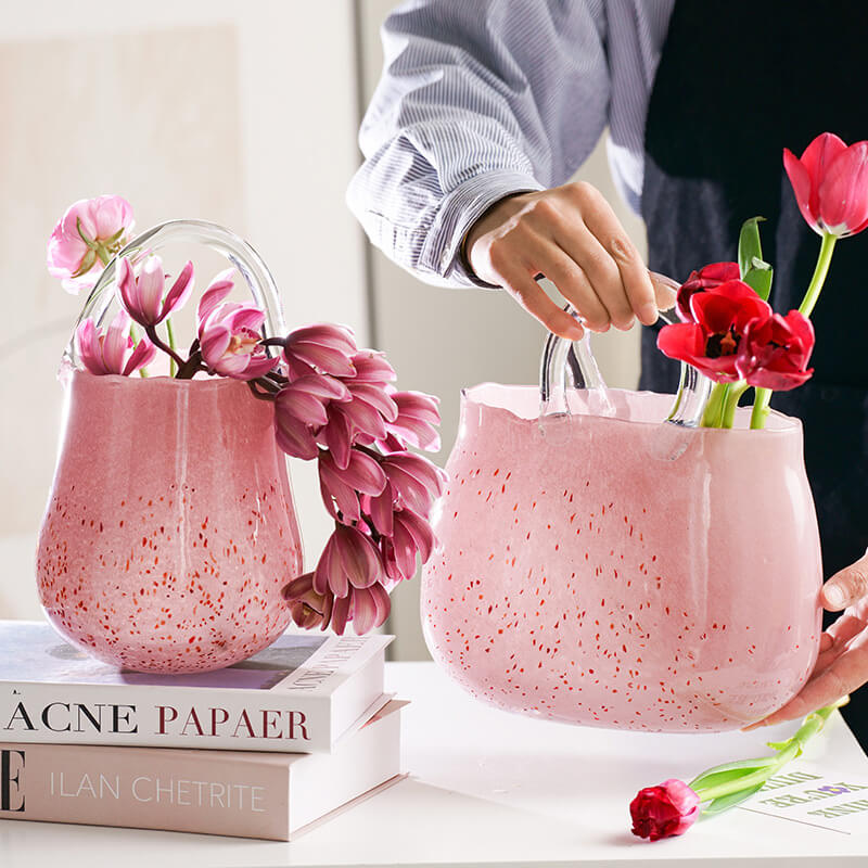 - Creative Element: This vase is a creative decor piece that stands out from traditional vases. The manual blowing technology gives it a unique and artisanal feel. The handbag design allows for creative flower arrangements. making it suitable for hydroponic use. It can hold fresh or artificial flowers. enhancing the beauty of the arrangement. The glass material allows light to pass through. highlighting the design and creating a beautiful display.