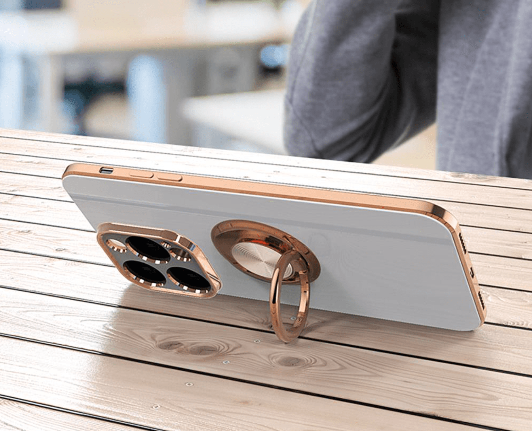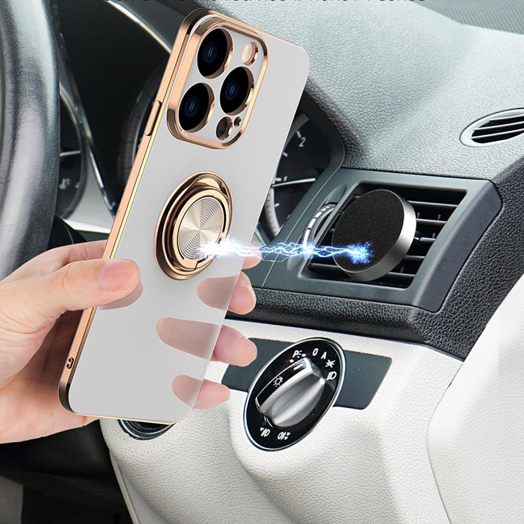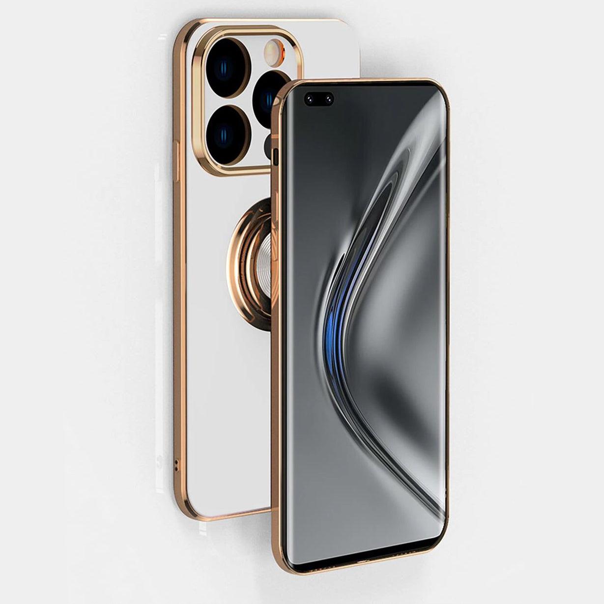 This stylish cover complements the elegance of your iPhone 14 Pro Max. 14 Plus. 14 Pro or 14 with Gold electroplated edges. It is of top quality and provides your phone with protection against scratches and severe damage in the event of a fall. All functions of the phone such as the use of buttons and connectors work flawlessly. This back cover in Black comes with a built-in ring holder which can be used with magnetic car mounts. Style and functionalities shine in this mobile accessory.