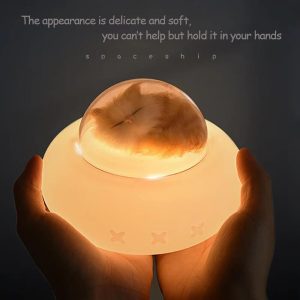 - Cute Spaceship Hull: The lamp features a rounded spaceship design with porthole windows. antennae. and retro rocket thrusters. crafted from smooth. squeezable silicone in pure white. The hull is durable. chew-resistant. and perfect for little hands to hold or hug.