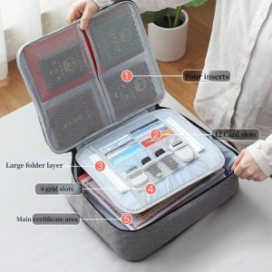 Inside the bag. you will find multiple pockets and compartments for efficient document organization. This multi-layer document classification bag provides ample and versatile storage space. It can hold passports. credit cards. USB drives. SD cards. university diplomas. and other important documents. ensuring everything is well-covered and organized.