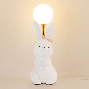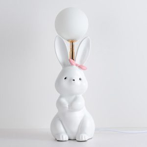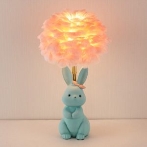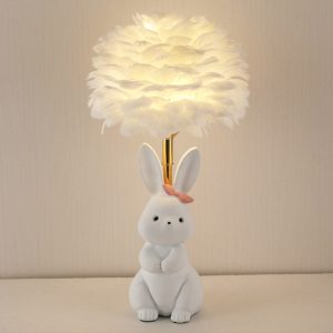 - Charming Rabbit Base: The lamp features a sculptural metal rabbit figurine. with intricate details like long ears. a fluffy tail. and a seated pose that exudes warmth and playfulness. The rabbit is finished in a smooth. matte color that complements the feather shade.