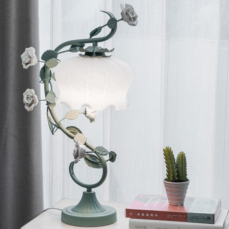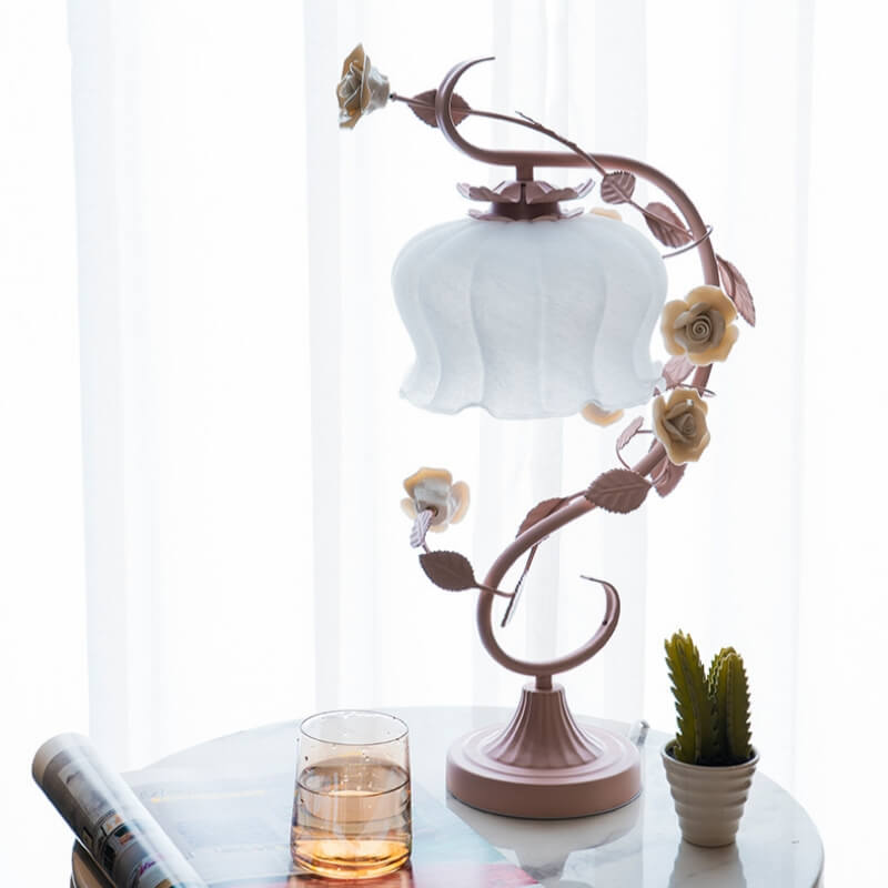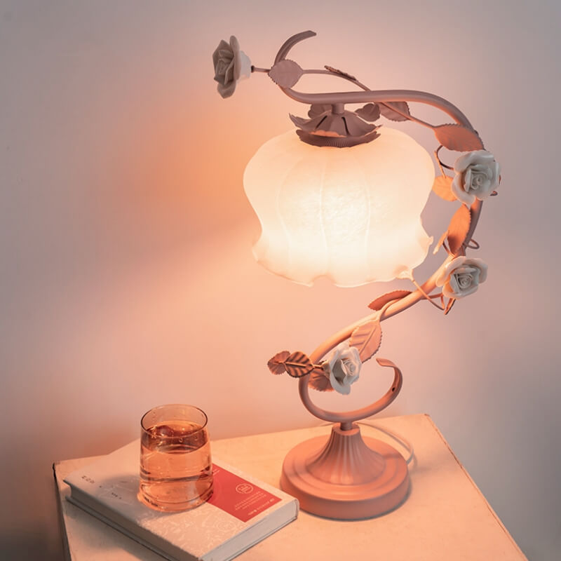 - Vintage Garden Vibe: The metal stem and base. finished in antique bronze or white. evoke the charm of a retro garden fence. while the glass lampshade (shaped like a cloche or vase) encases the flowers. creating a preserved-bloom effect.