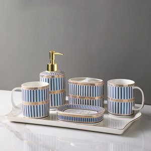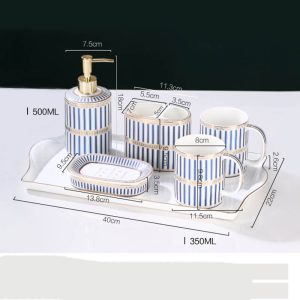 - Aesthetic Appeal: The set features a striking striped pattern that adds a touch of sophistication and visual interest. The gold-plated elements. strategically incorporated into the design. provide a luxurious contrast to the ceramic base. The combination of the stripes and the gilt creates a harmonious and elegant look that can enhance various bathroom decor styles. from classic to contemporary.