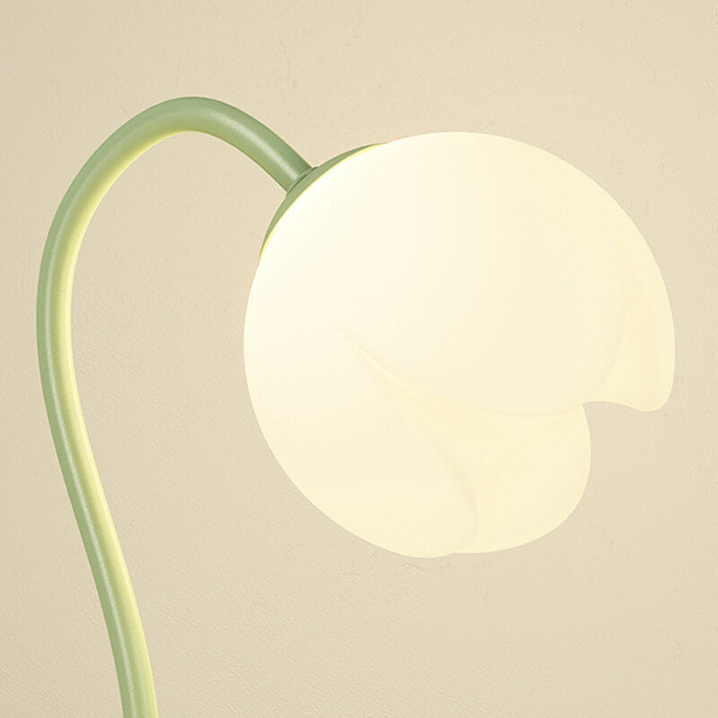 - Curved Glass Shade: The lampshade mimics the delicate petals of a tulip. with smooth. curved glass panels that converge at the top. creating a lifelike floral shape. The glass may be clear. frosted. or tinted in soft pastels (pink. purple. or white) to enhance the tulip aesthetic.