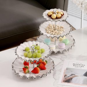 - Unique Texture: The embossed ripple patterns on the ceramic plates add depth and visual interest. elevating the presentation of desserts. The contrast between the smooth iron frame and the textured ceramic creates a harmonious blend of materials. enhancing the stand’s artistic appeal.