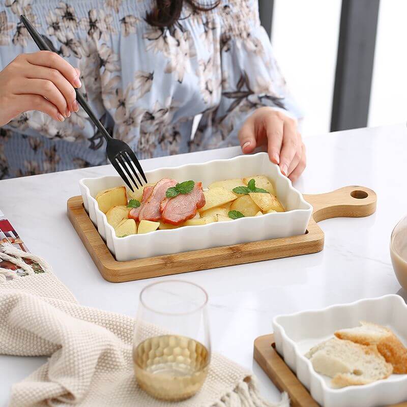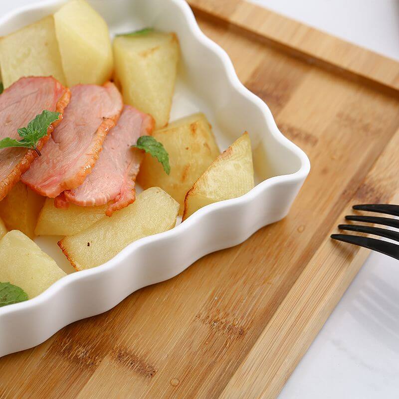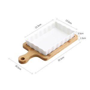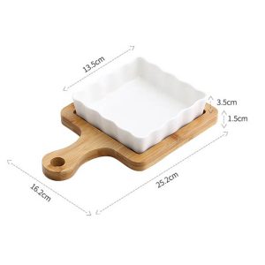 This wavy square ceramic baking dish features a unique and elegant design with a wooden base. making it a stylish and functional addition to any kitchen. Its high-quality ceramic material ensures even heat distribution for perfectly baked goods. and its deep shape is perfect for a variety of dishes.