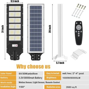 Illuminate your outdoor spaces with the 1000W Solar Street Light—a high-performance. energy-efficient solution designed for security. efficiency. and ease of use. Boasting 80.000 lumens of daylight-like brightness. intelligent motion sensing. and rugged weather resistance. this light transforms dark areas into well-lit. secure zones—all with zero electricity costs.
