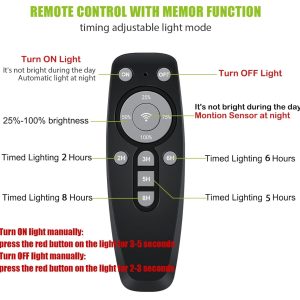 - Timed Lighting: Set 2. 3. 5. 6. or 8-hour countdowns via remote for event-based or overnight security lighting.